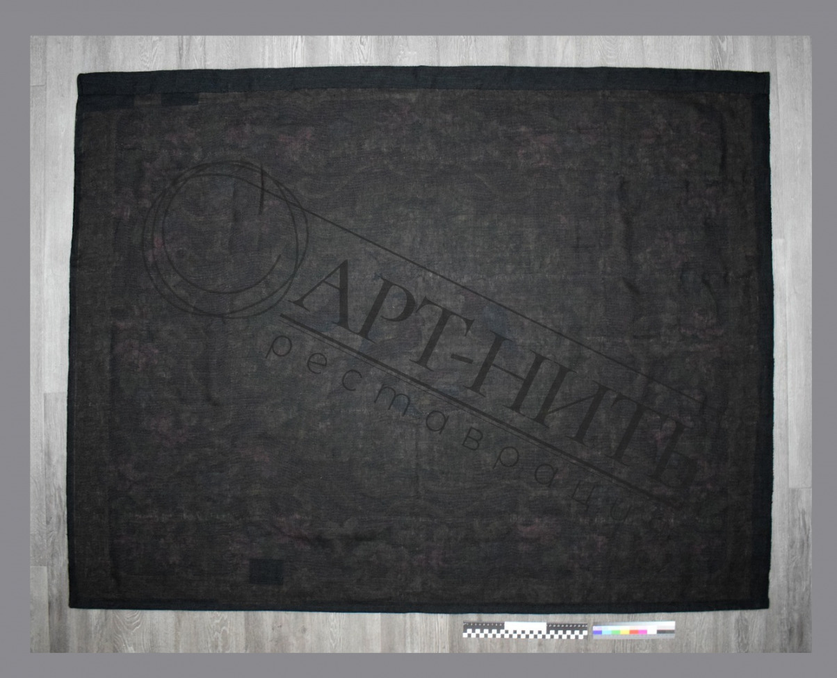 Выполнено общее обеспыливание ковра, и общая очистка выбранным способом. Подобраны реставрационные материалы, тонированы прямыми красителями. Выполнено фрагментарное дублирование разрывов и сечений ковра с последующим укреплением иглой тонированными нитями, швом "реставрационная сетка". Края ковра продублированы и укреплены иглой тонированными нитями. Сшита новая подкладка из льняной ткани, тонированной в чёрный цвет. По верхнему краю оформлен "карман" для возможности последующего монтажа ковра на стену.