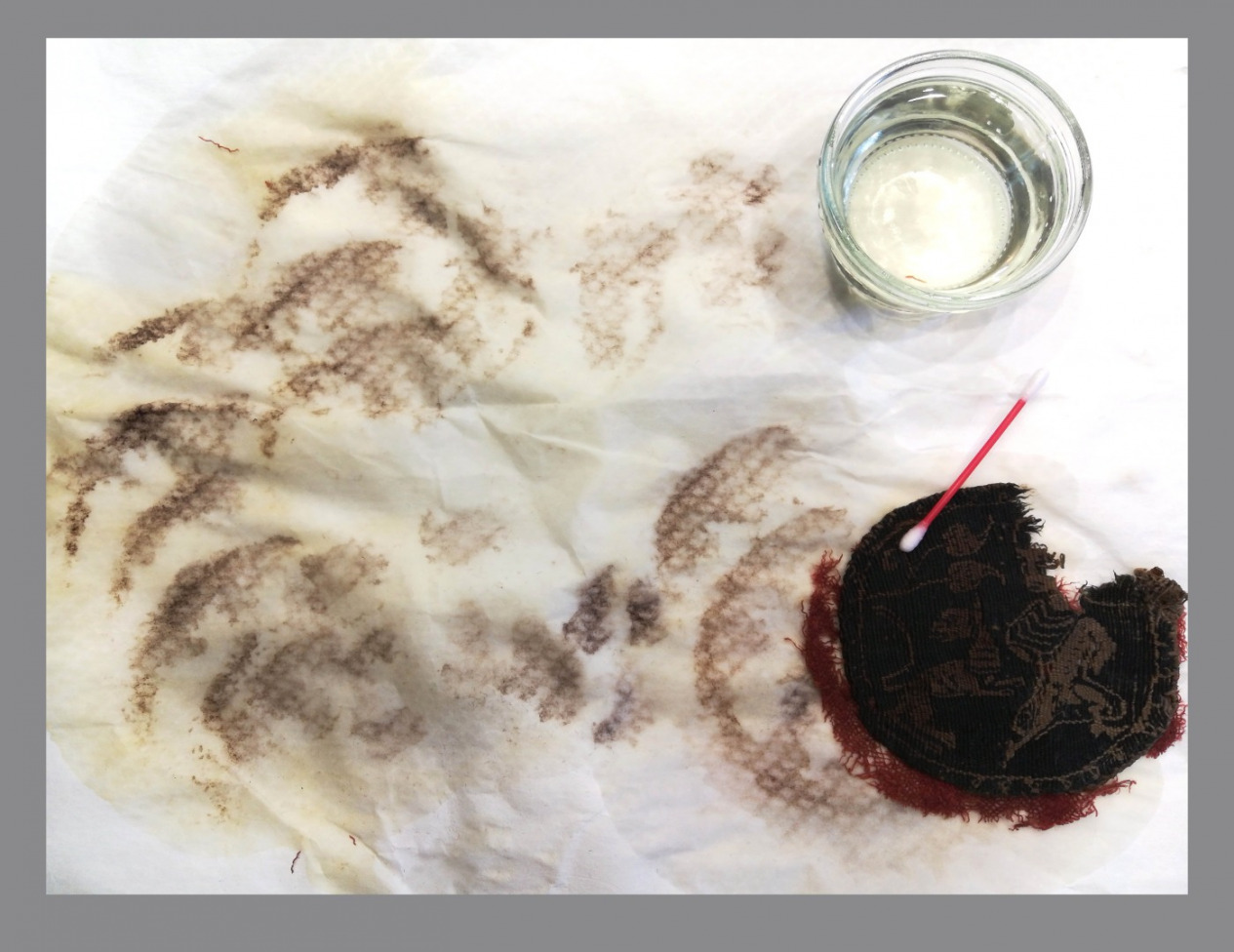 Сохранность: сильные загрязнения и общее запыление. Утрата фрагмента медальона, потёртости, выцветание, вытрепы и сечения нитей ткачества. Общая деформация.