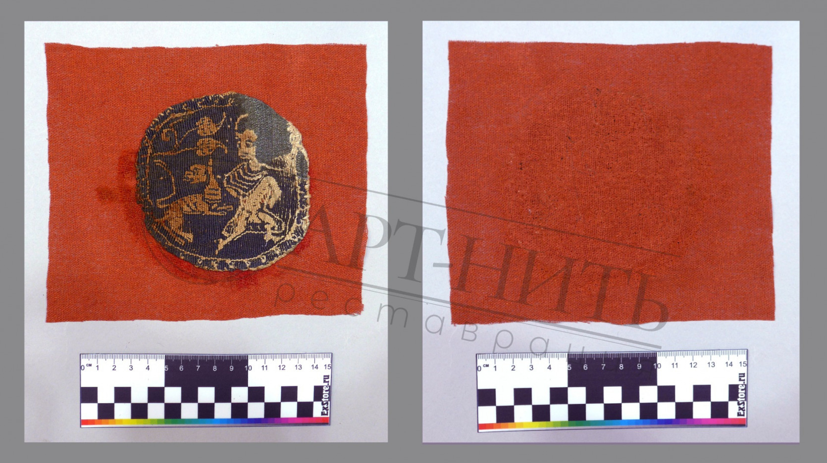 Двустороннее обеспыливание. Общая очистка водным способом на фильтовальной бумаге методом тампонирования. Устранение деформации. Подбор и тонирование реставрационных материалов. Восполнение утраченного фрагмента ткачества методом фрагментарного дублирования с последующим укреплением иглой. Общее дублирование на тонированный реставрационный материал бОльшего размера с целью дальнейшего монтажа на подрамник. .Укрепление иглой тонированными газовыми нитями.