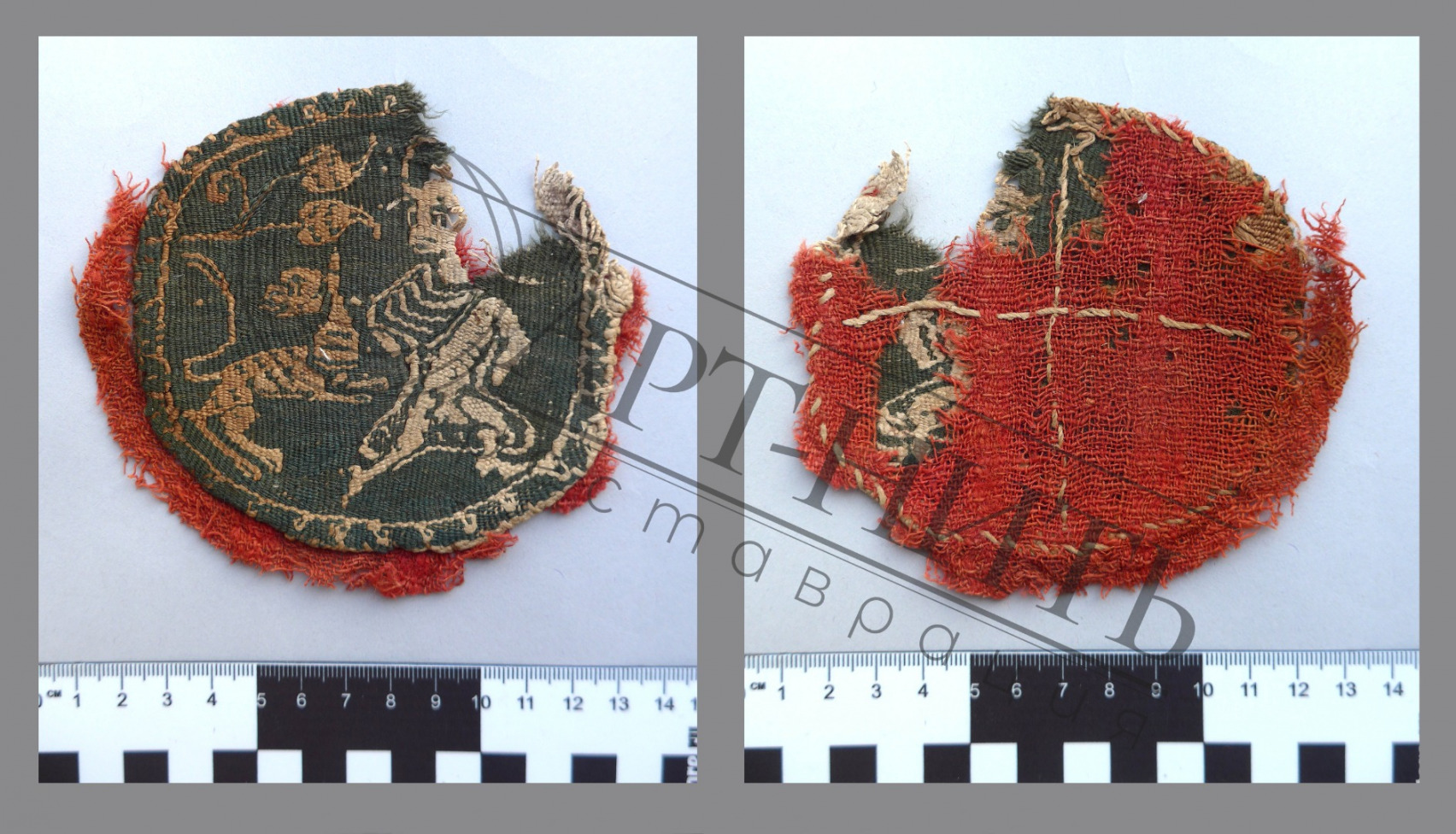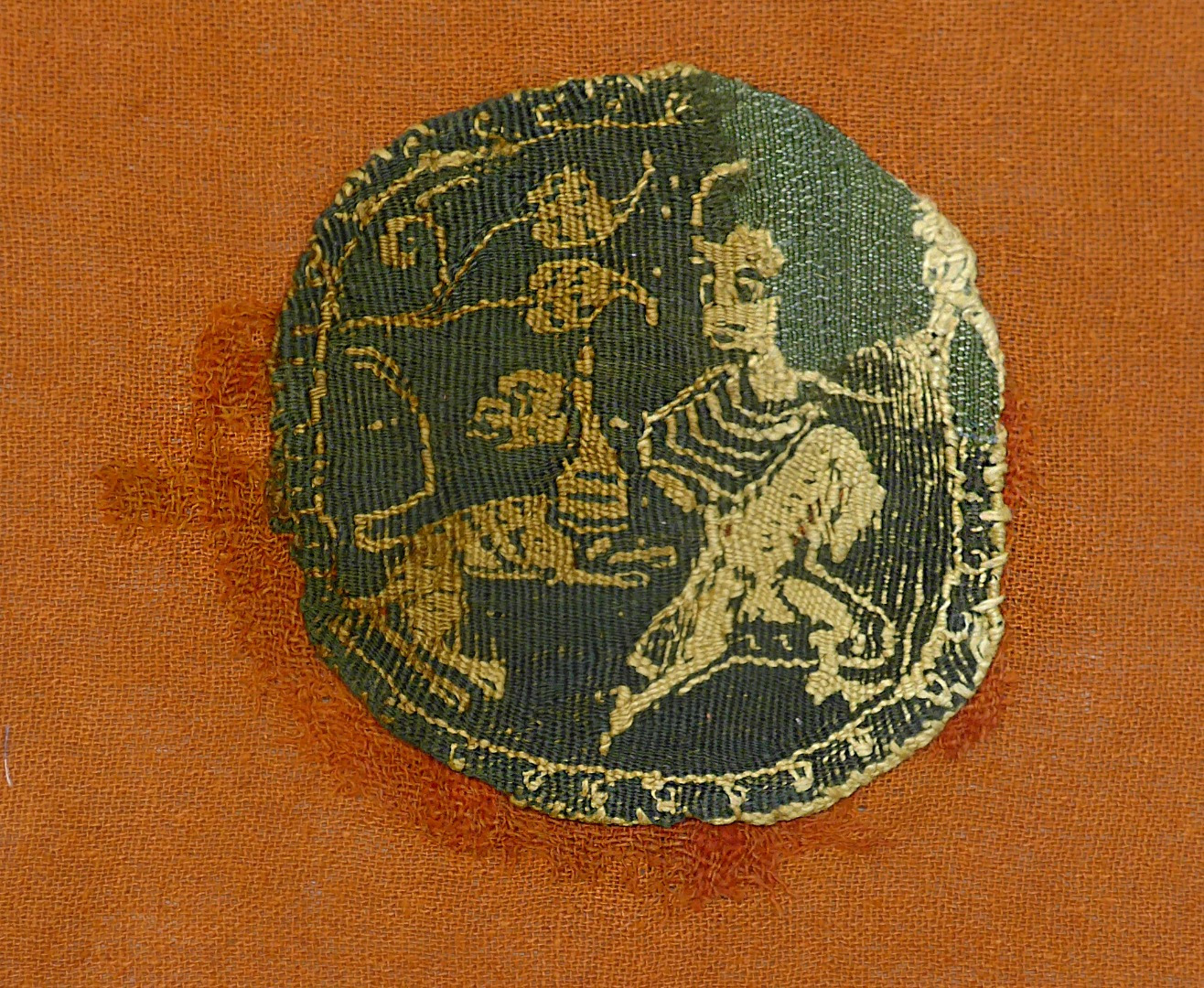 Коптский текстиль. Основная ткань: полотняное переплетение, шерсть окрашена в красно оранжевый цвет. Вставка: гобеленовая техника; лён не окрашен, шерсть зелёного цвета. В медальоне представлена сцена охоты. Понимается как проявление доблести, ожидаемая награда за которое - бессмертие.