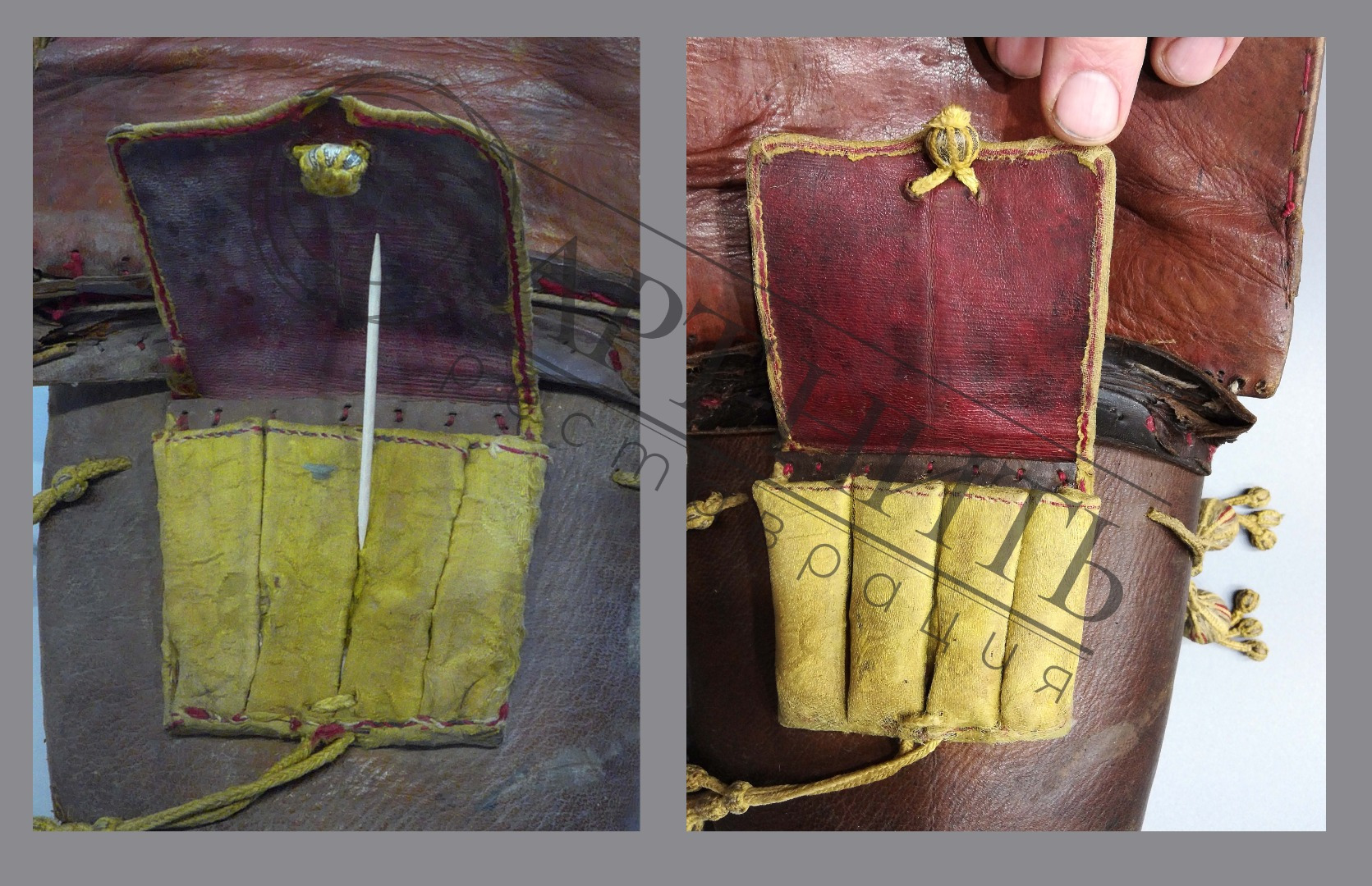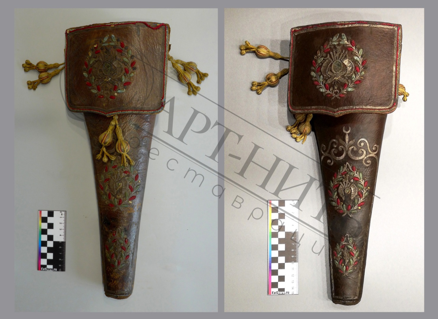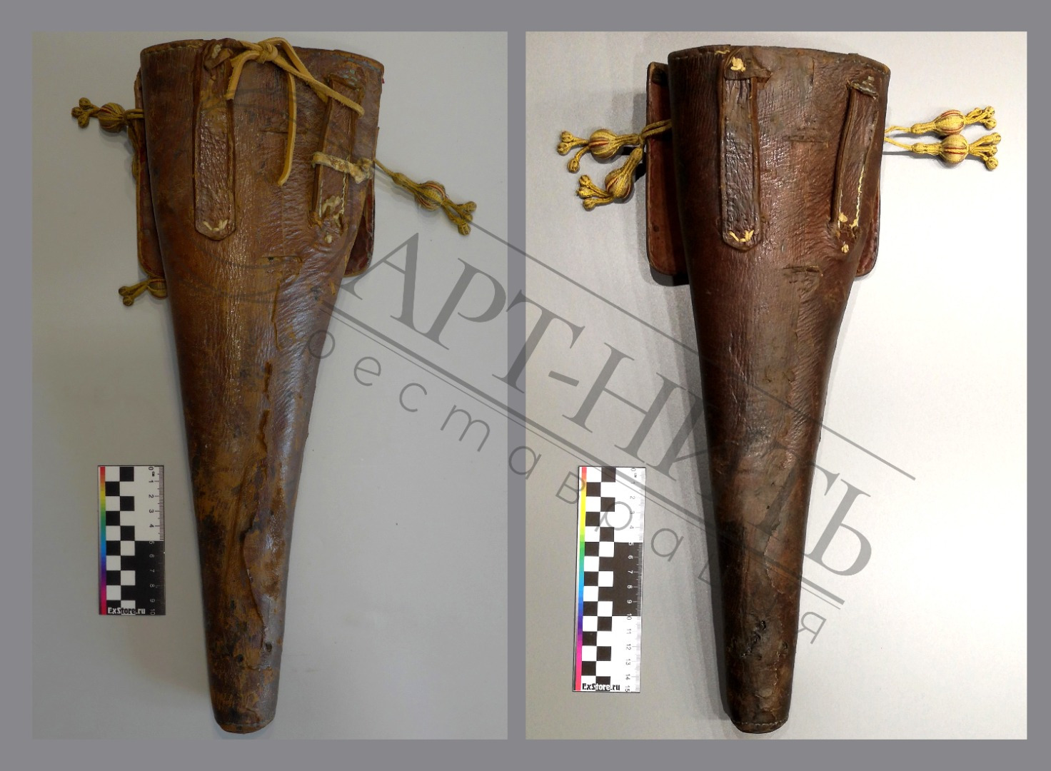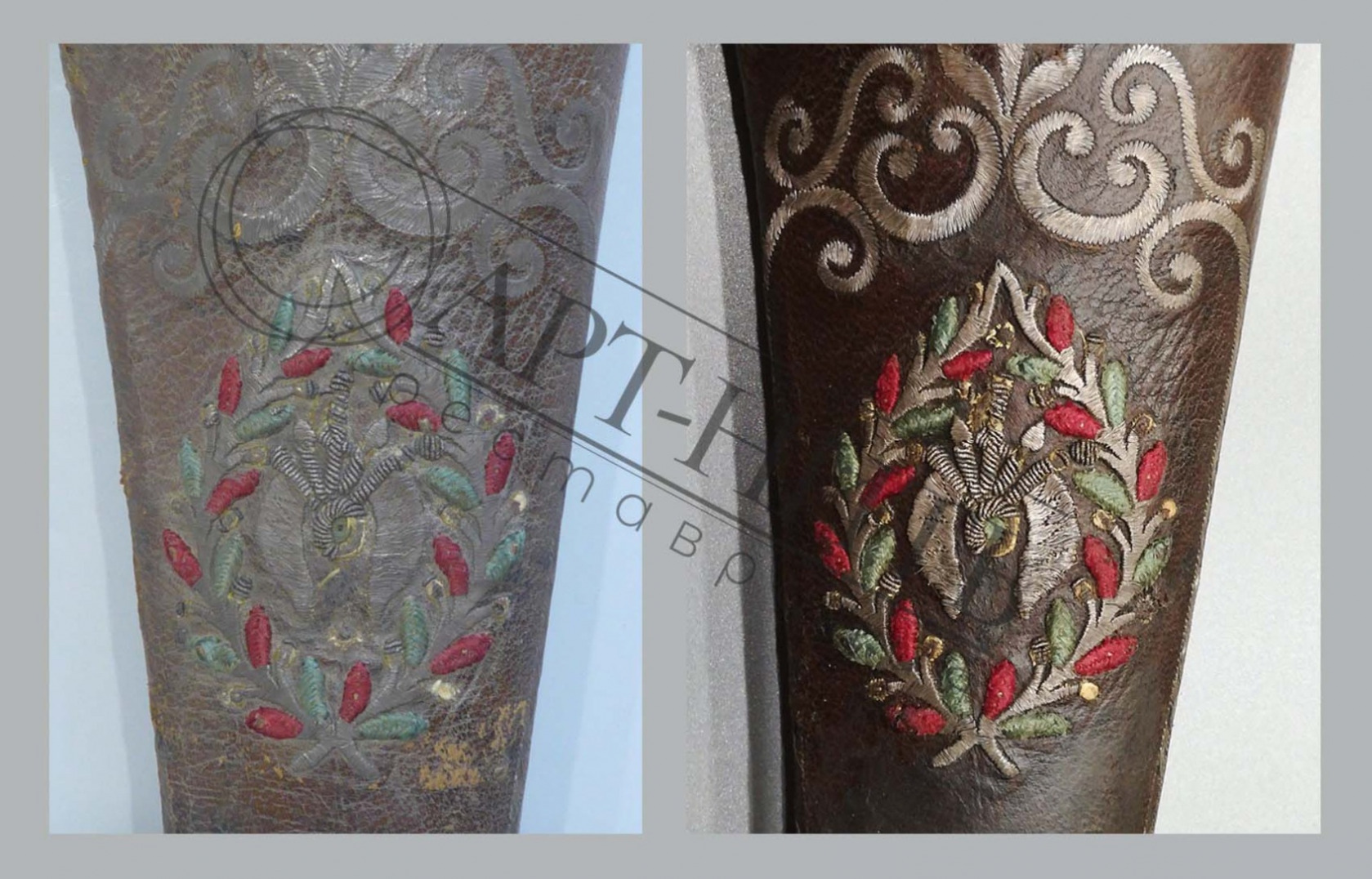 Реставрационные работы: Кожа очищена. смягчена и пластифицирована выбранным способом. Вышивка серебряными и шелковыми нитями тщательно очищена микротампонами с применением моющих средств. Отошедшие нити вышивки фиксировались при помощи реставрационного клея. Тканые элементы кобуры так же очищены и пластифицированы. Для укрепления разрывов и сечений ткани подобран и тонирован французский газ, укрепление выполнялось методом поверхностного перекрытия с реставрационным клеем. Подвесные декоративные элементы очищены водным способом, отстающие шелковые нити укреплены тонированными газовыми нитями.