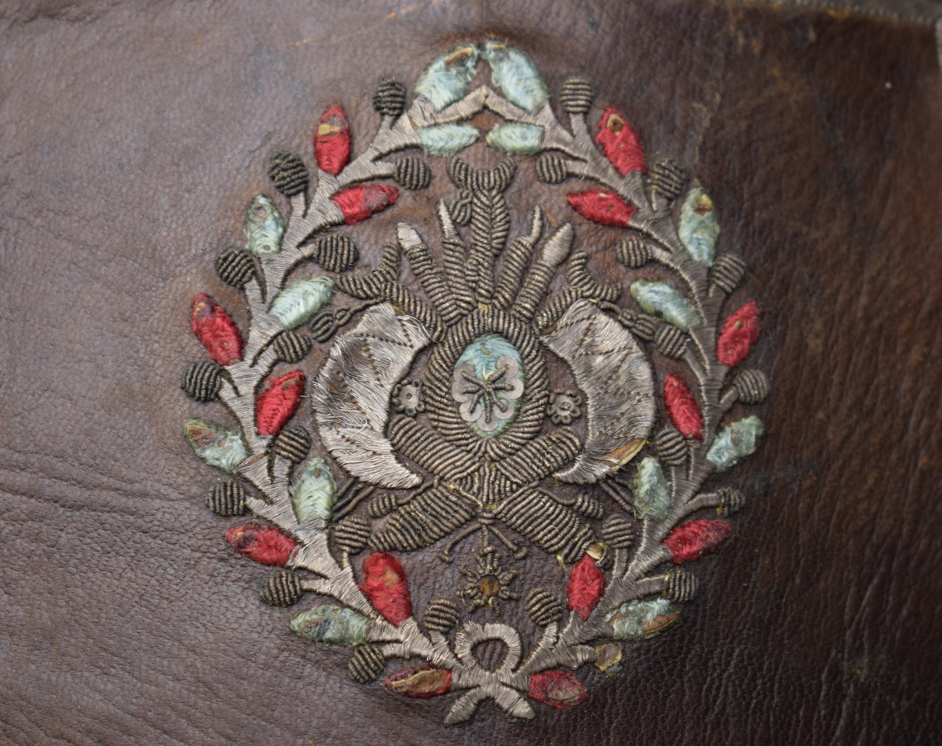 Сохранность: сильные загрязнения кожи, вышивки, тканей. декоративных элементов. Кожа местами потерта, имеет царапины и следы горения. Вытрепы нитей вышивки. На шелковой ткани сечения и разрывы.