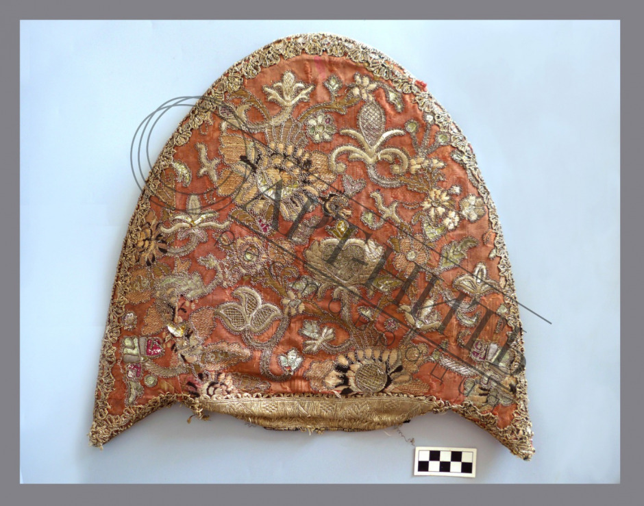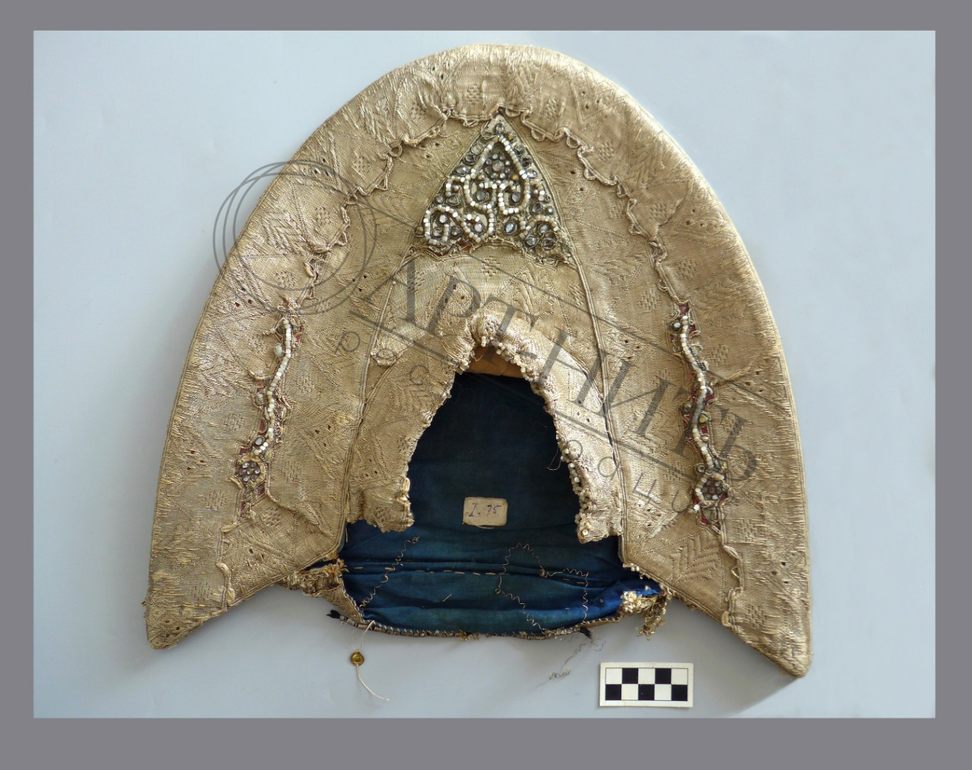 Сохранность: сильное общее загрязнение и запыление памятника. Пятна неизвестного происхождения. Разрывы и сечения тафты. Деформация золотных позументов, очелья. Фрагментарная утрата разноцветной эмали на декоративных элементах.