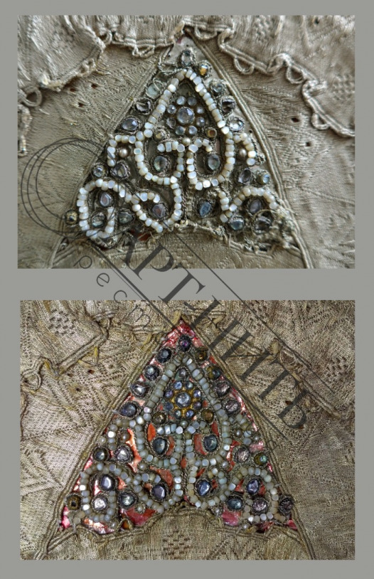 Материал: парча, золотный галун и нити, фольга, цветные стекла, колотый перламутр, холст, картон